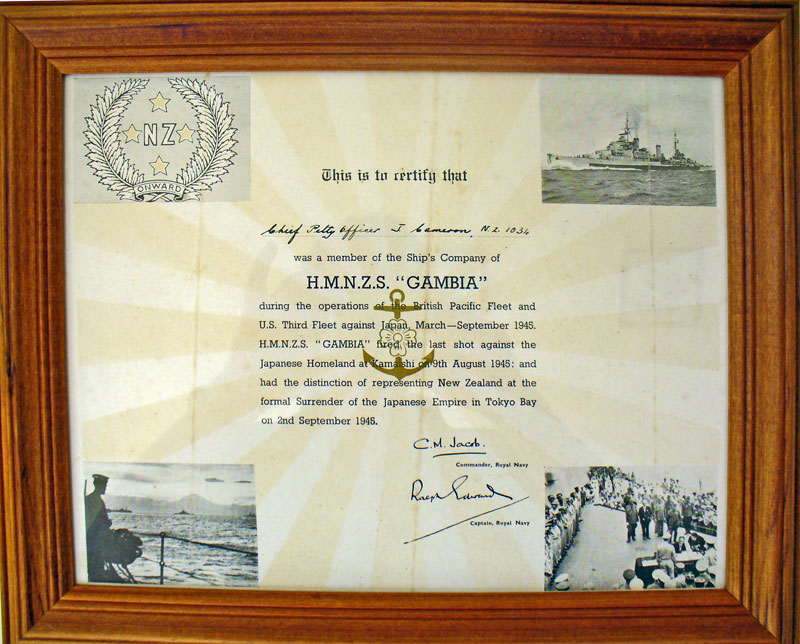 He spent the war serving on HMNZS Gambia as Chief Petty Officer torpedoman. Jack was present at the Japanese surrender in Tokyo Bay and was awarded the DSM for actions during the encounters with the Kamikaze. The award was listed in the London Gazette of January 1, 1946, and he also received an appreciation certificate from King George.