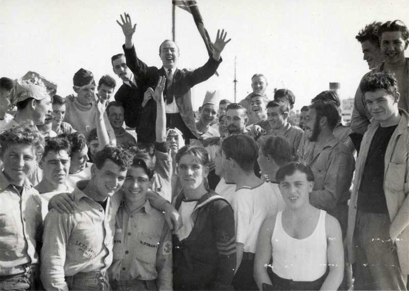 Day and night the sailors hauled great mooring lines to the mooring buoys which bob like giant children's tops off the minaretted waterfront. Spontaneous cheering by British and foreign merchant crews greeted the sailors' work. One mooring craft was lifted out of the water by a foreign merchant ship's propeller which started to turn prematurely. Another was rammed and beached. But both craft were brought back into service within twelve hours by the ship’s engineers.