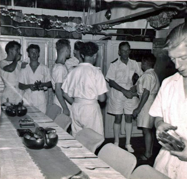 The photo below was supplied by Inst. Lt. Cdr. Paul O. Stanley and is of the cooks stirring the Christmas 1955 pudding.