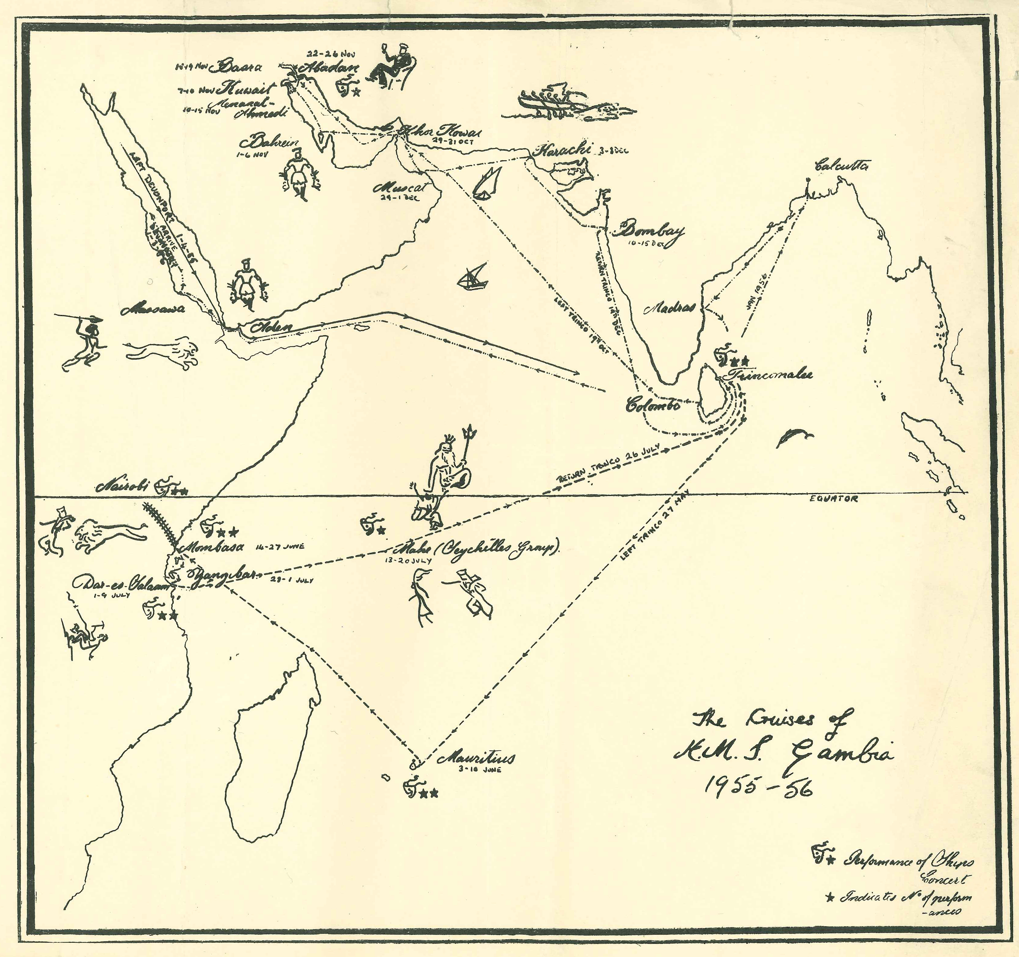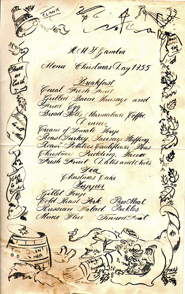 On June 14, 1955, the ship arrived in Kilindini harbour, Mombasa, Kenya. On June 21, they were visited by a group of children from the Mombasa European Primary School (MEPS). Gambia stayed at Mombasa for two weeks, leaving on June 27. After this they stopped at Zanzibar where they played host to the Sultan, Khalifa bin Harub. Then on to Dar-es-Salaam, Tanzania which they reached on July 1. On July 4, at least some of the crew enjoyed a brewery run. From Tanzania they left for Victoria, the capital city of Seychelles.