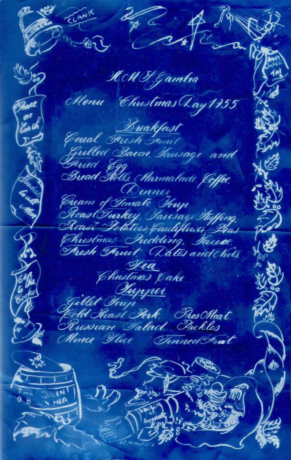 The above menu, dated February 27, 1956, was very kindly donated by Janet Kirkham, niece of Sick Berth Attendant Kenneth George Griffin.