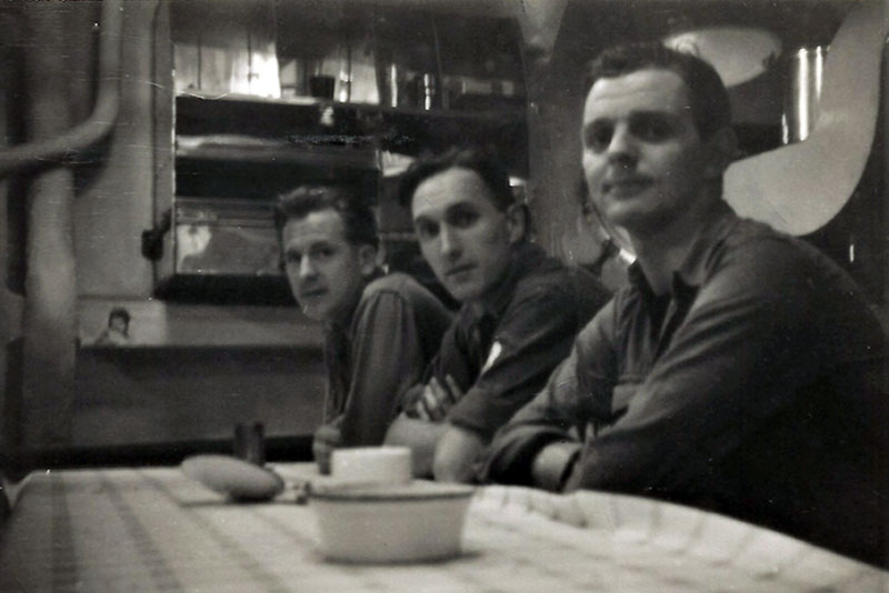 Leading Telegraphist John "Jock" Aire on left front, Ordinary Telegraphist Harold Geoff Beestin, Telegraphist G. "Jock" Redpath. Front right, holding the phone is the leading hand of the watch, who is anonymous, looking at the back of the head of Ordinary Telegraphist Nev Blockley.