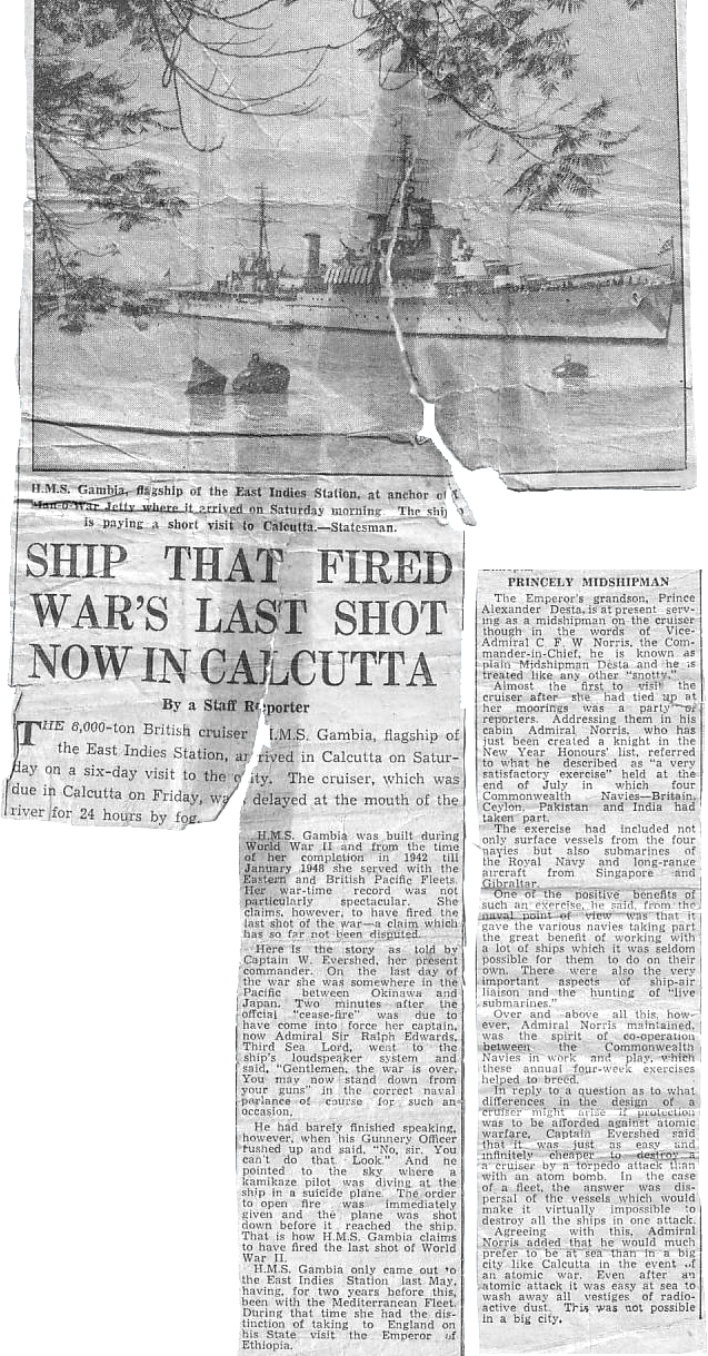 HMS Gambia was built during World War 11 and from the time of her completion in 1942 till January 1948 she served with the Eastern and British Pacific Fleets. Her war-time record was not particularly spectacular. She claims, however, to have fired the last shot of the war — a claim which has so far not been disputed.