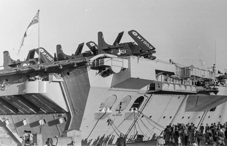 HMS Albion (R07) - The aircraft carrier entered service in May 1954, and was decommissioned in 1973. The ship carried various aircraft such as Sea Hawk FGA.6 fighter-attack aircraft, Sea Venom FAW.21 night/all-weather fighters, Skyraider AEW.1 early-warning aircraft, Whirlwind HAS.7 anti-submarine helicopters, and a Dragonfly HR.5 helecopter for search-and-rescue duties.