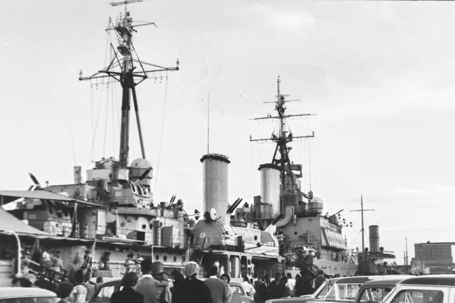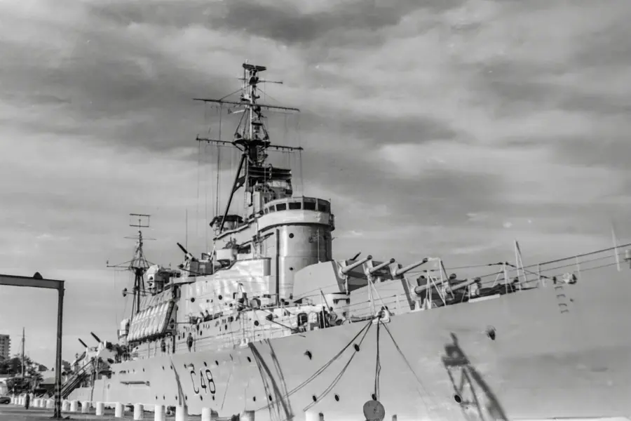 HMS Gambia (C48) - A Crown Colony-class cruiser. She was commissioned in February 1942 and transferred to the New Zealand Navy in September 1943 as HMNZS Gambia. She was returned to the Royal Navy in July 1946. She was put into reserve in December 1960, and finally scrapped in 1969. The visit to Durban was one of her last public duties.