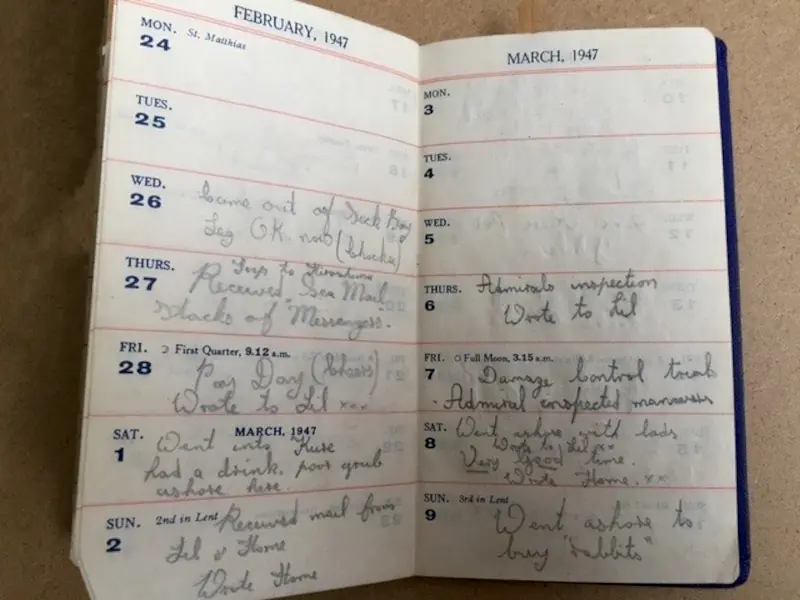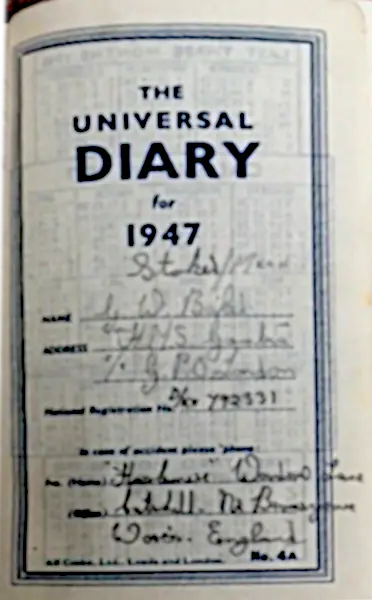 My dad, known to family and friends as Bill, joined the navy on 14 February 1946. He joined the Gambia as a stoker. His diary tells us that on 30th December 1946 they were in Singapore and he was cleaning the funnel, the next 3 days he was boiler cleaning in 'A' boiler room. When they finished the boiler room cleaning he went to watch a football match then for a few drinks at the canteen with Vin and Charlie where they had 'Big Eats'.