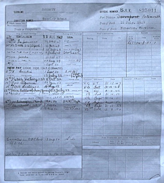 Stanley was born on July 22, 1929, in Nuneaton, Warwickshire. He joined the Roayl Navy on August 13, 1947, with the service number SKX 835011. His first training was at HMS Excalibur, a shore base which was near Crewe in Cheshire. He would later serve on Independence, Wizard, Victory, Alunia, Bellerophon, and from February 22, 1949 to July 13, 1952 on HMS Gambia as a stoker/mechanic. He left the navy on August 12, 1954, after 7 years of service. Stanley died in 2003.