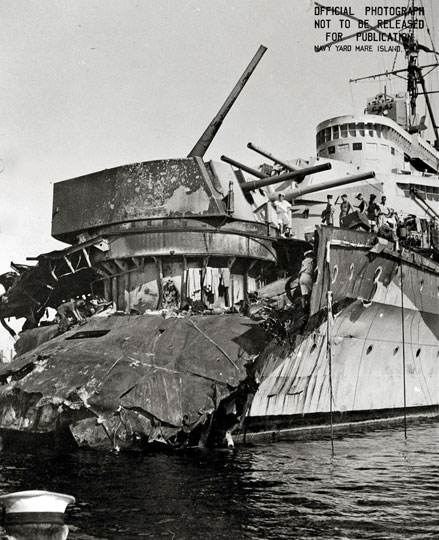 In November 1942, there was a reft and weapons upgrade. The addition of improved radar meant the Supermarine Walrus aircraft and their catapults could go. The port crane and catapult were removed in September 1943 and the other crane centralised for use with the ship's boat and the hangars converted for other uses. The starboard became a mess deck, the port a recreation space / chapel / cinema. The two 20mm guns on X-turret (the upper of the aft turrets) was insufficient AA defence for a ship, so the pom-poms were replaced with 10 x 2 20mm guns. The removal of the planes meant the ship need not carry the aviation fuel for them either, which meant more space was available below decks. In 1940, HMS Liverpool had her bow blown off when a torpedo detonated the 5,700 gallons of aviation fuel stored forwards and was out of action for a year.