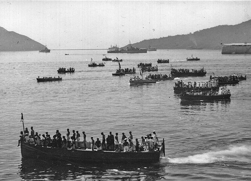 The bridge was teeming with them. One of them was thrown off the flag deck onto an awning and then over the foc'sle. A couple were taken to sick bay but thanks to good providence nobody was seriously hurt. One cheeky b climbed in through a port, put all the plugs in the officers bathroom, turned all the taps on, took all the tap tops off and stowed them in a wine box. All the cabins in that region were flooded. What a laugh! One of them pinched one of the Captain's brass dolphins ( huge things) dived over the side with it and put it in his boat as booty. How he managed to swim with it I don't know.